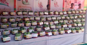 মেলা ঘুরে দেখা গেছে, চত্বরের প্রধান ফটকের পাশেই রাখা হয়েছে এ আমের প্রদর্শনী। কত বাহারি নাম। এসব আম দেখতে ভিড় করছে মানুষ।