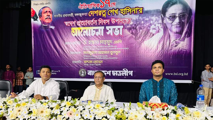 শনিবার দুপুরে ঢাকা বিশ্ববিদ্যালয়ের টিএসসি মিলনায়তনে প্রধানমন্ত্রী শেখ হাসিনার স্বদেশ প্রত্যাবর্তন দিবস উপলক্ষ্যে বাংলাদেশ ছাত্রলীগ আয়োজিত আলোচনা সভায় প্রধান অতিথির বক্তব্যে তিনি এসব কথা বলেন।