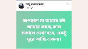 তবে মঙ্গলবার রাতে আবু সালেহ স্বপন ব্যক্তিগত ফেসবুক আইডি থেকে এ ঘটনা নিয়ে পোস্ট দিয়েছেন। পোস্টে তিনি লিখেছেন, ‘অপহরণ না, আমার বউ আমার কাছে। কাল সকালে দেখা হবে। একটু দুরে আছি এজন্য’।