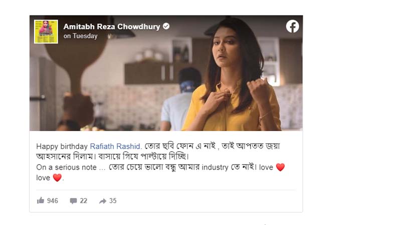 অমিতাভ রেজা নিজের ওয়ালে জয়া আহসানের একটি ছবি প্রকাশ করে ক্যাপশনে লেখেন— ‘Happy birthday Rafiath Rashid. তোর ছবি ফোন-এ নাই, তাই আপাতত জয়া আহসানের দিলাম। বাসায় গিয়ে পাল্টায়ে দিচ্ছি। On a serious note… তোর চেয়ে ভালো বন্ধু আমার industryতে নাই। love ❤️ love ❤️.’