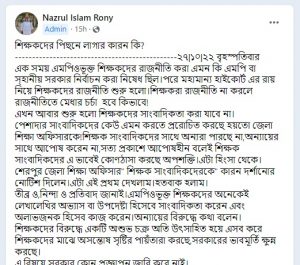 তিনি পোস্টে লিখেন, একসময় এমপিও ভুক্ত শিক্ষকদের রাজনীতি করা এমন কি এমপি বা স্থানীয় নির্বাচন করা নিষেধ ছিল পরে মহামান্য হাইকোর্টের রায় নিয়ে শিক্ষকদের রাজনীতি শুরু হলো। শিক্ষকরা রাজনীতি না করলে রাজনীতিতে মেধার চর্চা হবে কিভাবে ? এখন আবার শুরু হলো শিক্ষকদের সাংবাদিকতা করা যাবেনা । স্থানীয় সাংবাদিকদের কেউ কেউ শিক্ষা অফিসারকে প্ররোচিত করছে । সত্য প্রকাশে আপোষহীন বলেই শিক্ষক সাংবাদিকদের এভাবেই কোণঠাসা করছে শিক্ষা অফিস মিলে এই অপশক্তিগুলো। এটা হিংসা থেকে করা হচ্ছে।