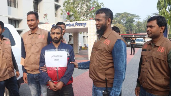 পিরোজপুরে মাদক মামলার হাজিরা দিতে এসে আদালত চত্বর থেকে এক পুলিশ সদস্যের মোটরসাইকেল চুরি করে নিয়ে যান ফয়সাল শেখ (৩২) নামে এক যুবক। পরে পুলিশ অভিযান চালিয়ে শনিবার সকালে মোটরসাইকেলসহ