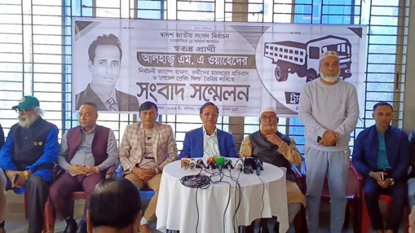 ময়মনসিংহ-১১ (ভালুকা) আসনে সহকারী রিটার্নিং কর্মকর্তার অপসারণ, নির্বাচনে লেভেল প্লেয়িং ফিল্ড নিশ্চিত করা, নির্বাচনী ক্যাম্পে হামলা ও কর্মীদের মারধরের প্রতিবাদে সংবাদ সম্মেলন করা হয়েছে। ট্রাক প্রতীকের স্বতন্ত্র প্রার্থী এমএ ওয়াহেদের