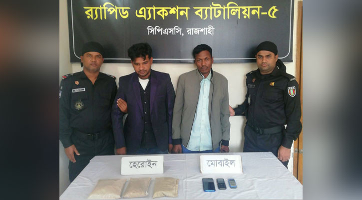 রাজশাহী মহানগরীতে দুই কেজি হেরোইনসহ ২ মাদক কারবারীকে আটক করেছে র্যাপিড অ্যাকশন ব্যাটালিয়ন (র্যাব)। যার আনুমানিক মূল্য দুই কোটি টাকা। রোববার (২০ নভেম্বর) ভোর ৫টার দিকে মহানগরীর আমচত্বর এলাকা থেকে