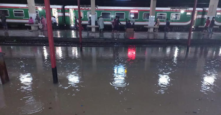 ভয়াবহ বন্যায় পানিতে তলিয়ে গেছে সিলেট রেলওয়ে স্টেশনের পার্কিং এলাকা ১ ও ২ নম্বর রেললাইন। তবে রেলওয়ের ৩ ও ৪ নম্বর লাইন এলাকা শুকনো থাকায় এ দুটি লাইনে ট্রেন চলাচল