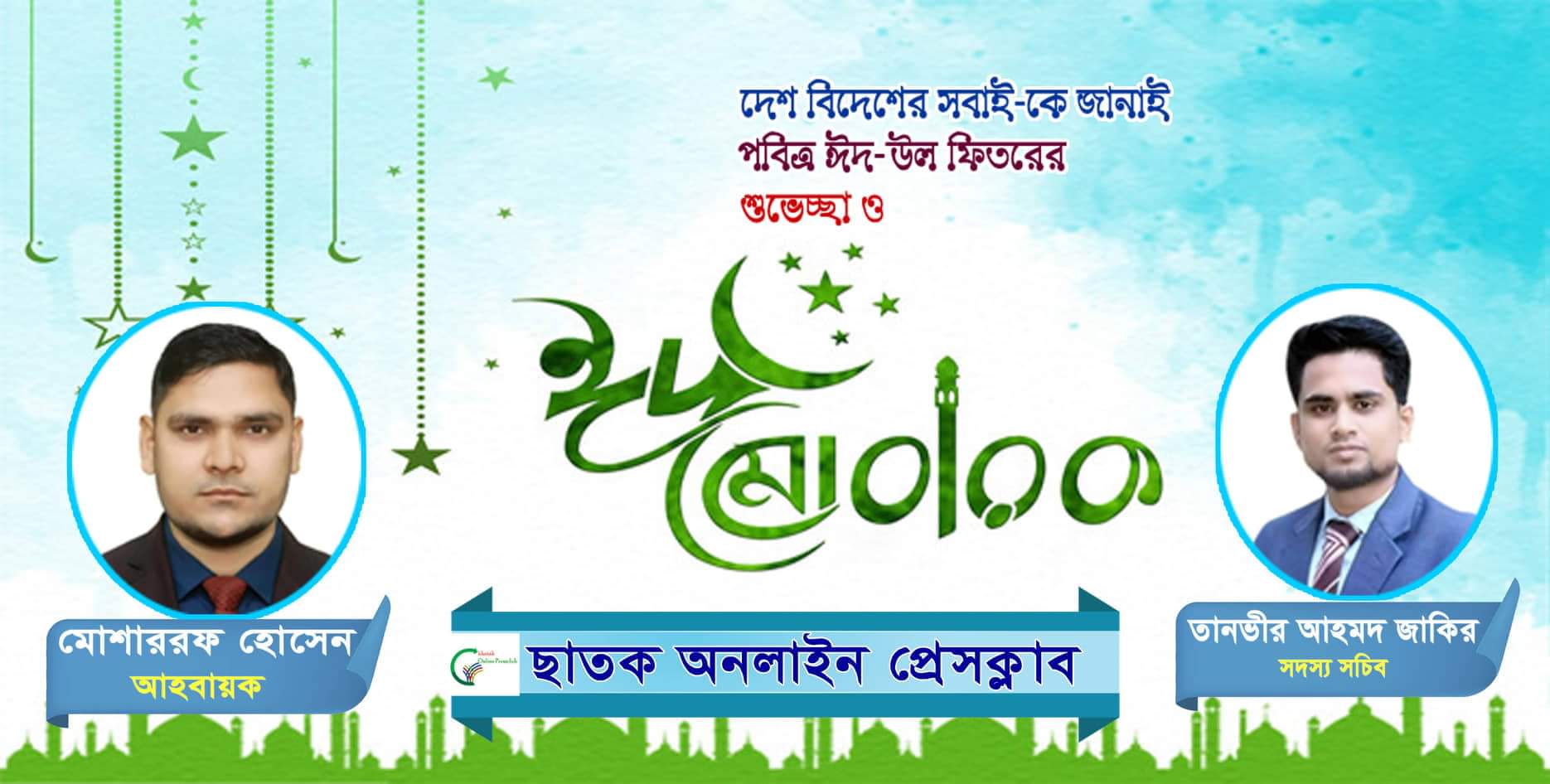 শুভেচ্ছা বার্তা: মুসলিম জাহানের প্রধান ধর্মীয় উৎসব ঈদুল ফিতর উপলক্ষে ছাতক উপজেলা বাসীসহ ও বিশ্বের সব মুসলমানকে আন্তরিক শুভেচ্ছা ও ঈদ মোবারক জানিয়েছেন ছাতক অনলাইন প্রেসক্লাবের আহবায়ক মোশাররফ হোসেন ও