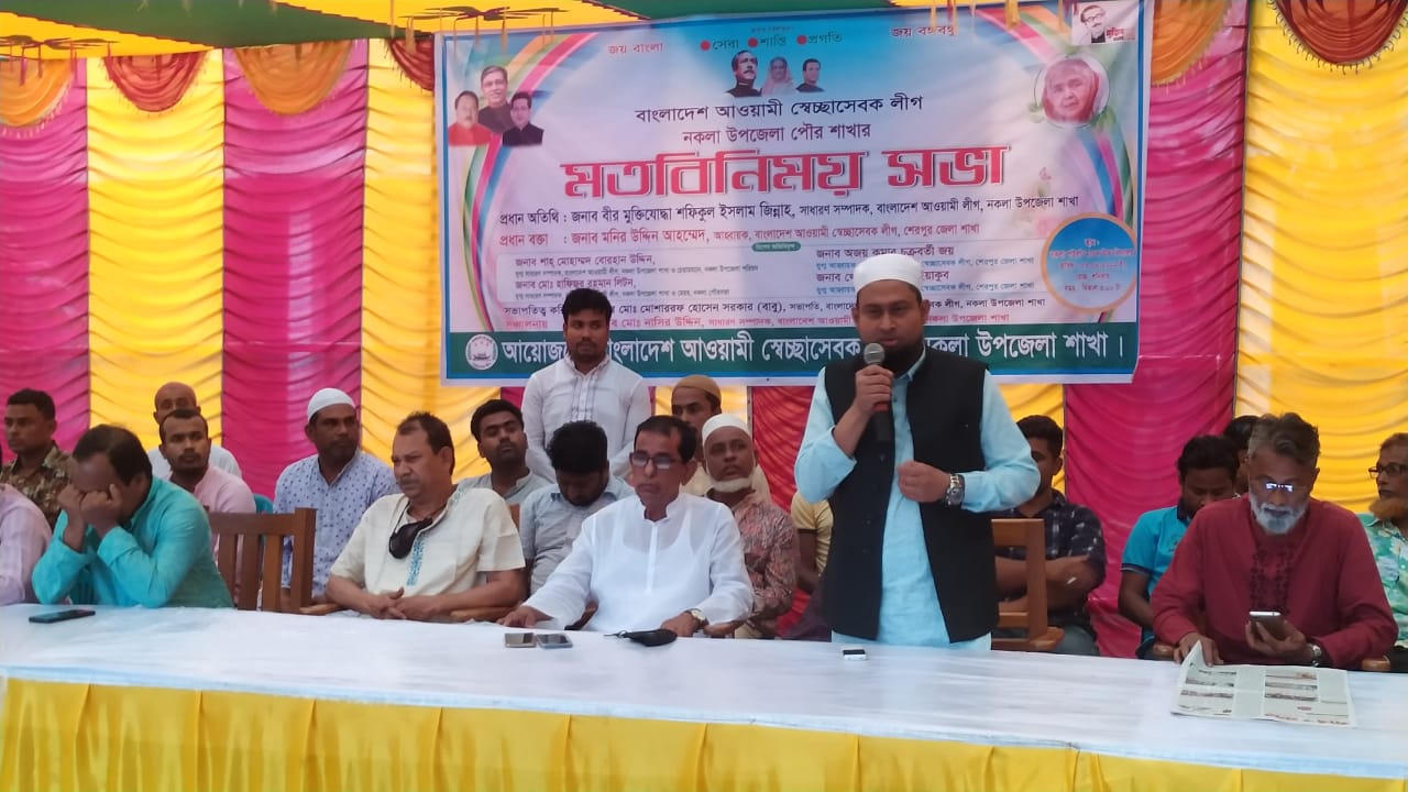 মিন্টু খন্দকার, নকলা প্রতিনিধি: জয় বাংলা জয় বঙ্গবন্ধু শ্লোগান ধর মাননীয় প্রধানমন্ত্রী শেখ হাসিনা র হাত কে শক্তিশালী করো” সেবা শান্তি প্রগতি “স্বেচ্ছাসেবক লীগের মূল নীতি “এই শ্লোগানকে সামনে রেখে