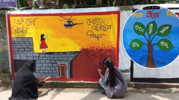 নতুন বাংলাদেশ গড়ার প্রত্যয়ে ফেনী শহরের দেয়ালে দেয়ালে ‘স্বাধীনতা এনেছি সংস্কারও আনবো’, ‘দুর্নীতি ঠেকাতে আওয়াজ তুলুন’, ‘ভয়ের দেওয়াল ভাঙলো’, ‘এবার জোয়ার এলো ছাত্র জনতার’, ‘ধর্ম যার যার বাংলাদেশ সবার’, এসব