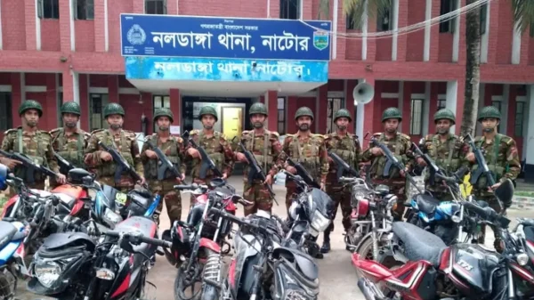 নাটোরের নলডাঙ্গায় লুটপাট করতে ১১টি মোটরসাইকেলে গ্রামবাসীর ওপর আক্রমণের চেষ্টা করে সন্ত্রাসীরা। পরে সেনাবাহিনীর উপস্থিতি টের পেয়ে মোটরসাইকেল ফেলে পালিয়ে যায় তারা। রোববার (১১ আগস্ট) দুপুরে উপজেলার পচারমোড় এলাকায় এ