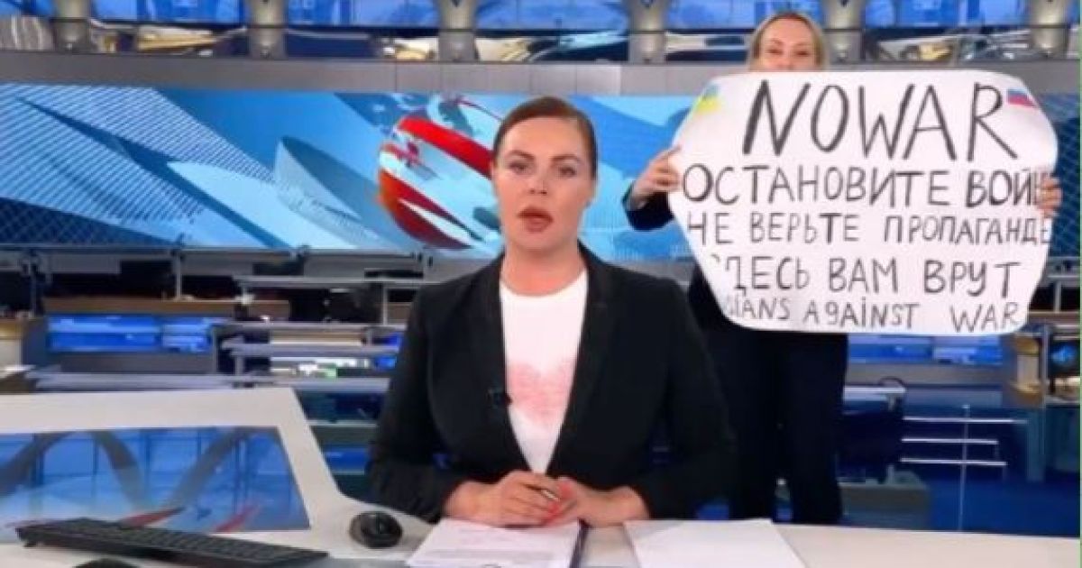 রাশিয়ার প্রধান রাষ্ট্রীয় টিভি চ্যানেল ‘চ্যানেল ওয়ান’-এর সংবাদ পরিবেশনের সময় হঠাৎ করে এক নারী এসে যুদ্ধবিরোধী বিক্ষোভ দেখান। সংবাদ উপস্থাপকের পেছনে স্পষ্ট দেখা যাচ্ছিল ওই নারীকে। তার প্ল্যাকার্ডে লেখা ছিল