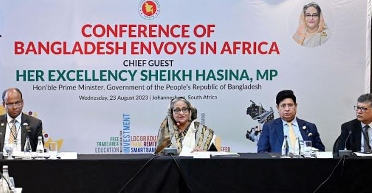 প্রধানমন্ত্রী শেখ হাসিনা আফ্রিকান দেশগুলোতে নিয়োজিত বাংলাদেশি রাষ্ট্রদূতদের দ্বিপক্ষীয় বাণিজ্য, ব্যবসা ও বিনিয়োগ বাড়ানোর লক্ষ্যে কাজ করার নির্দেশ দিয়েছেন। দক্ষিণ আফ্রিকা সফররত প্রধানমন্ত্রী বুধবার (২৩ আগস্ট) হোটেল রেডিসন ব্লু স্যান্ডটনে