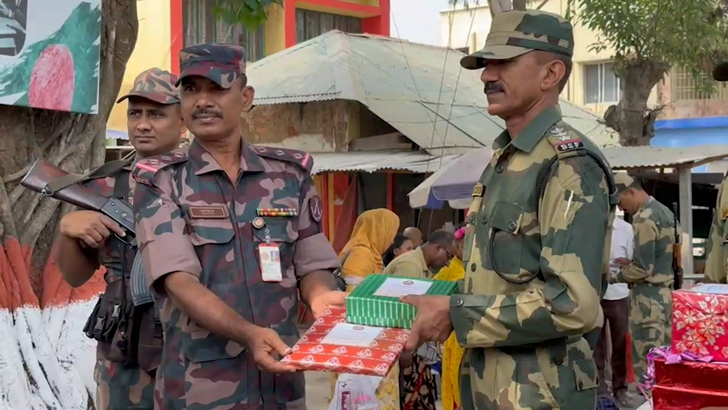 পবিত্র ঈদুল ফিতর উপলক্ষ্যে দিনাজপুরের হিলি সীমান্তে ভারতীয় সীমান্ত রক্ষি বাহিনী বিএসএফকে মিষ্টি উপহার দিয়ে শুভেচ্ছা জানিয়েছে বর্ডার গার্ড বাংলাদেশ বিজিবি। এসময় বিএসএফের পক্ষ থেকেও বিজিবিকে মিষ্টি উপহার দিয়ে শুভেচ্ছা