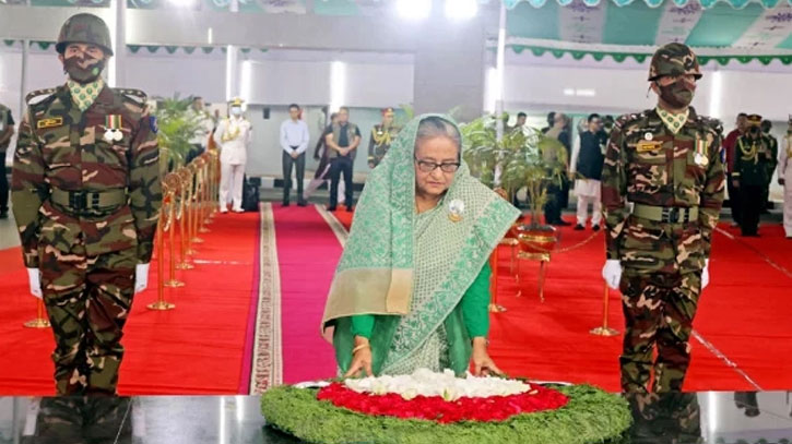 ঐতিহাসিক মুজিবনগর দিবসে প্রধানমন্ত্রী শেখ হাসিনা ধানমন্ডি ৩২ নম্বরে জাতির পিতা বঙ্গবন্ধু শেখ মুজিবুর রহমানের প্রতিকৃতিতে পুষ্পস্তবক অর্পণের মাধ্যমে শ্রদ্ধা নিবেদন করেছেন। সোমবার (১৭ এপ্রিল) সকালে তিনি বঙ্গবন্ধু স্মৃতি জাদুঘরের
