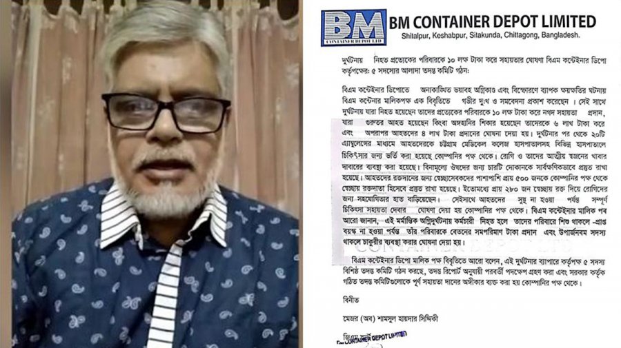 সীতাকুণ্ডে বিএম কনটেইনার ডিপোতে অগ্নিকাণ্ডের ঘটনায় হতাহত ব্যক্তিদের পরিবারের দায়িত্ব নেওয়ার ঘোষণা দিয়েছে মালিকপক্ষ। একইসঙ্গে দুর্ঘটনায় মৃত প্রত্যেক ব্যক্তির পরিবারকে ১০ লাখ টাকা করে দেওয়ার ঘোষণা দিয়েছে তারা। রবিবার (৫