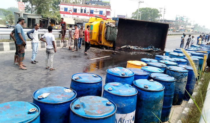 ঢাকা-টাঙ্গাইল-বঙ্গবন্ধু সেতু মহাসড়কে চাকা ফেটে উল্টে গেছে উত্তরবঙ্গগামী সয়াবিন তেলবাহী একটি ট্রাক। বৃহস্পতিবার (২৪ মার্চ) বেলা সাড়ে ১১টার দিকে টঙ্গাইল সদর উপজেলার আশেকপুর বাইপাস এলাকায় এ ঘটনা ঘটে। দুর্ঘটনায় কোনো