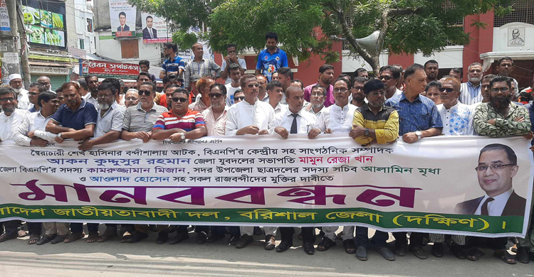 বিএনপির কেন্দ্রীয় সাংগঠনিক সম্পাদক আকস কুদ্দুসুর রহমান, জেলা যুবদলের সভাপতি মামুন রেজা খানসহ সব বন্দি নেতাকর্মীর মুক্তির দাবিতে বরিশালে মানববন্ধন কর্মসূচি পালন করা হয়েছে। বৃহস্পতিবার (১৭ আগস্ট) বেলা ১১টায় নগরীর