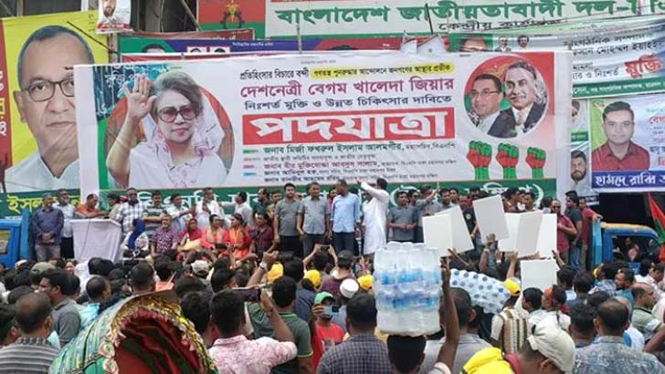 বিএনপি চেয়ারপারসন খালেদা জিয়ার মুক্তি ও তাকে বিদেশে উন্নত চিকিৎসার সুযোগ দেওয়ার দাবিতে ঢাকায় পদযাত্রা করবে বিএনপি। পদযাত্রাকে কেন্দ্র করে খণ্ড খণ্ড মিছিল নিয়ে নেতাকর্মীরা জড়ো হয়েছেন নয়াপল্টন বিএনপির কেন্দ্রীয়